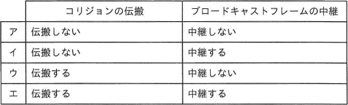 イーサネットにおいて,ルータで接続された二つのセグメント間でのコリジョンの伝搬と、宛先MACアドレスの全てのビットが1であるブロードキャストフレームの中継について,適切な組合せはどれか。